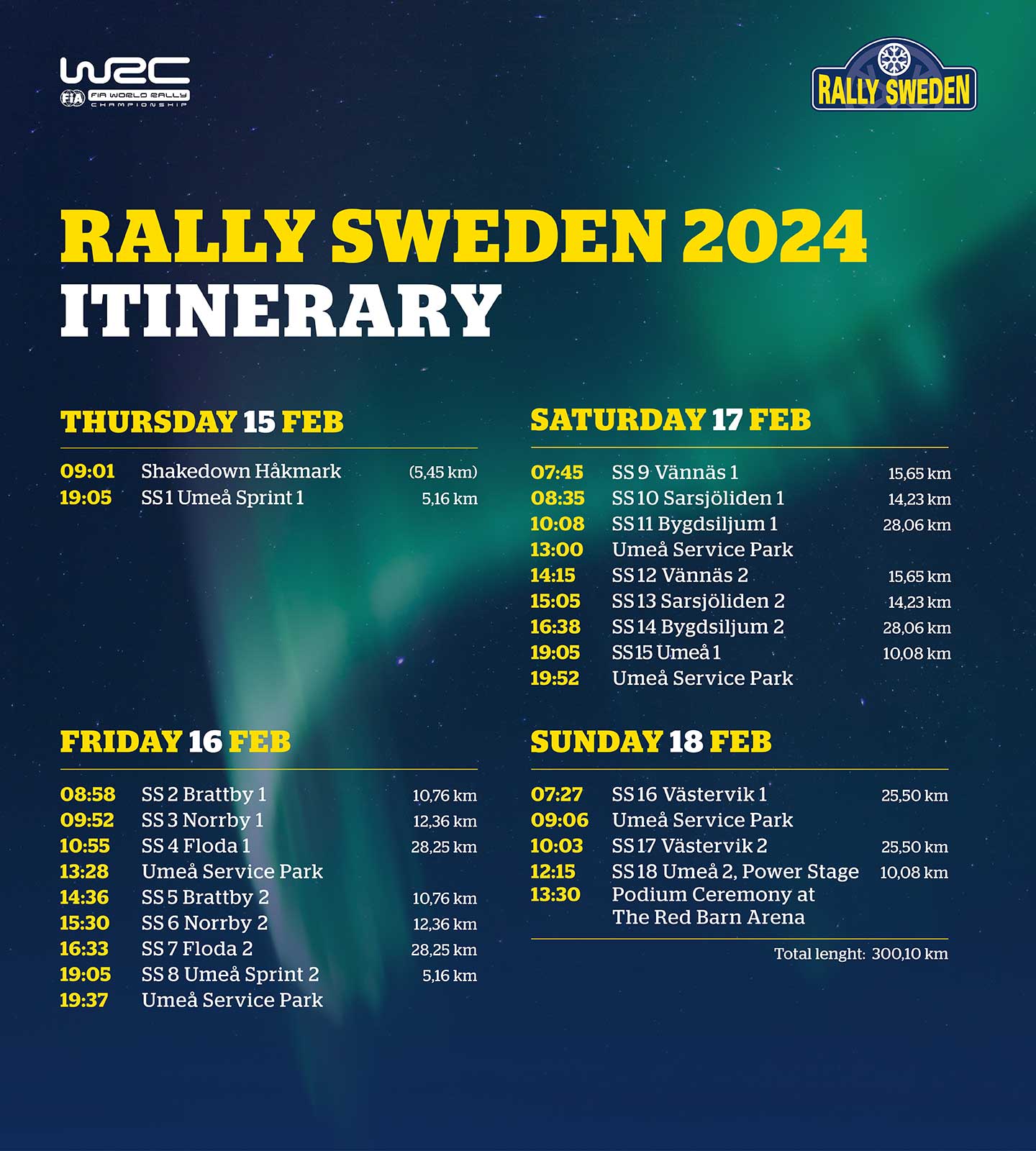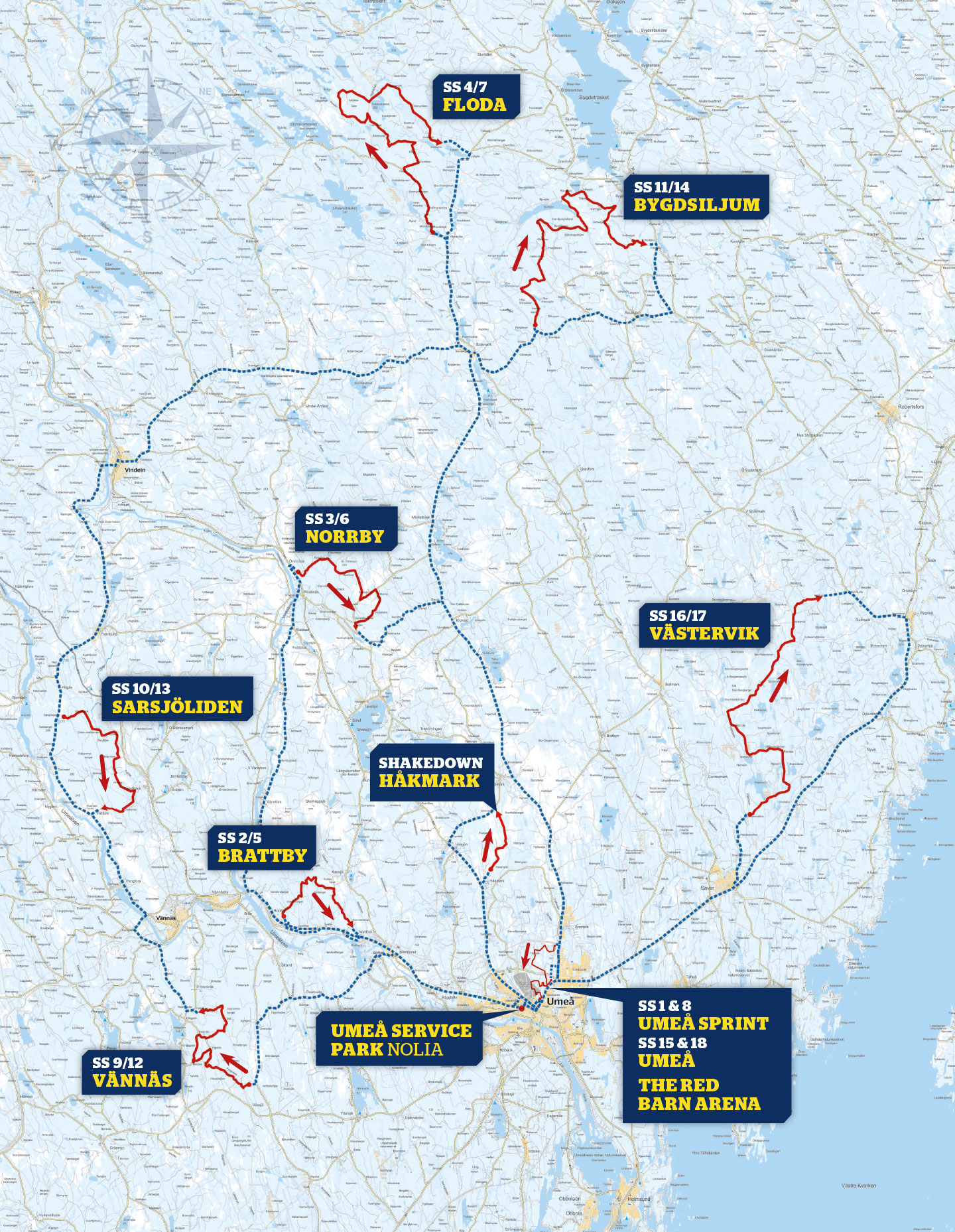 Nu är det klart. Nio utmanande sträckor som ska avverkas två gånger står på menyn, drygt 300 km specialsträcka. En tredjedel, ca 107 km av dem är nya gentemot förra året. Med transportsträckorna kommer teamen tillryggalägga minst 1100 km under helgen. Och som åskådare har du mängder av möjligheter att hitta precis din favoritplats i skogen eller på The Red Barn Arena i Umeå.